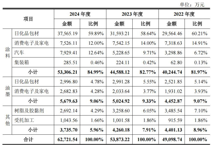 公司主要产品包括涂料、油墨等功能性涂层材料,树脂和胶黏剂等相关产品,以及受托加工树脂和添加剂业务。其中,涂料产品收入金额分别为4.024亿元、4.459亿元和5.331亿元,占主营业务收入的比例分别为81.97%、82.77%和84.99%;油墨产品收入金额分别为4,452.87万元、5,024.92万元和5,679.63万元,占主营业务收入的比例分别为9.07%、9.33%和9.06%。