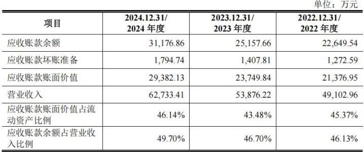 应收账款攀升,2024年应收账款余额占营收比例近5成